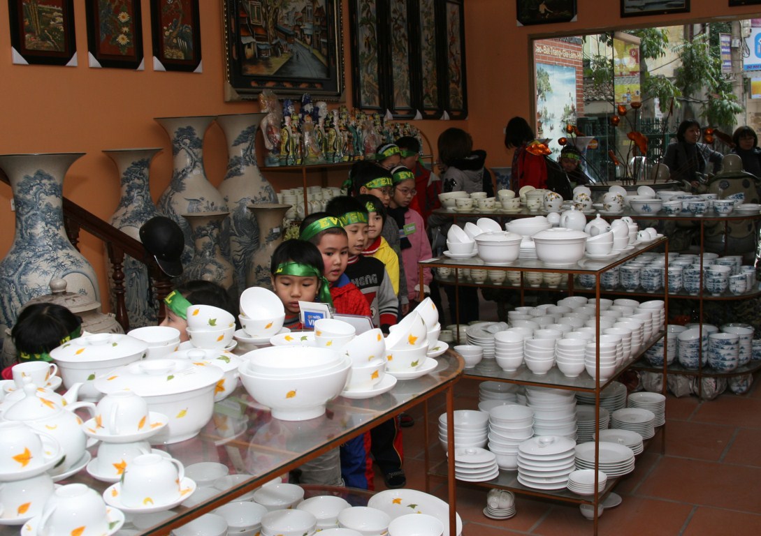 Xe dừng ở Đình làng Bát Tràng - nơi đến ngày Rằm tháng Hai (15/02 Âm lịch) - ngày Hội Làng, người dân nơi đây tụ tập tại Đình để làm lễ Rước Nước. Sau khi hội ý với nhau những câu hỏi để “phỏng vấn nghệ nhân”, chúng mình đi thăm cửa hàng trưng bày sản phẩm gốm số 130, đường Giang Cao và được nghe cô Nga - chủ cửa hàng giới thiệu rất nhiều sản phẩm đẹp với những nước men quý tưởng đã thất truyền nay đã được phục chế lại. Chúng mình còn được tham quan xưởng gốm phía sau nhà cô, nơi những nghệ nhân đang vẽ trang trí cho những bình hoa rất lớn. Chỉ vài nét chấm phá, dưới ngòi bút vẽ của những nghệ nhân, hoa lá, cỏ cây, sông núi hiện ra thật sống động