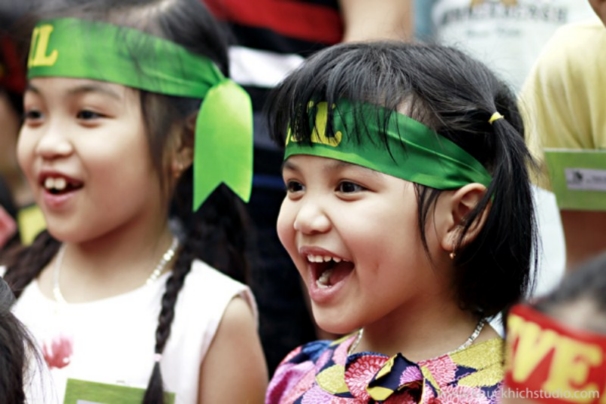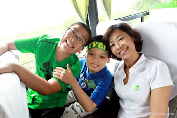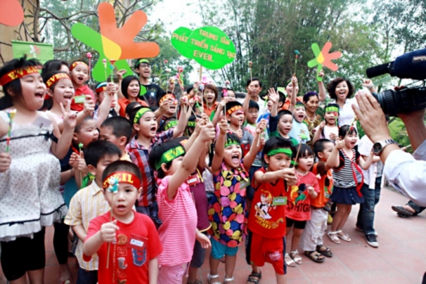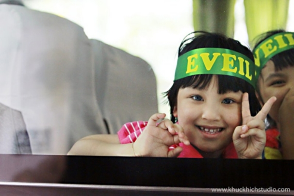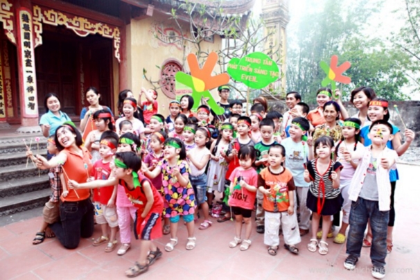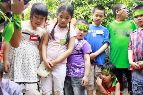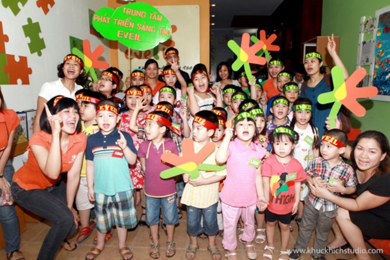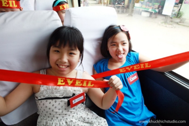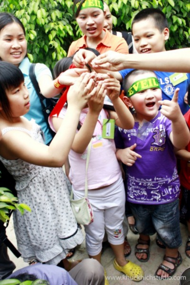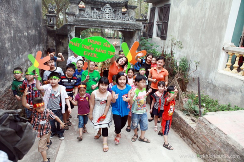 Trung tâm Eveil tràn ngập tiếng cười nói vui vẻ. Ai cũng rất háo hức lên đường. Tham gia hành trình “Nhập vai Nghệ nhân Tò He”, chúng mình được chia thành hai đội Xanh và Đỏ. Các anh chị phụ trách giúp chúng mình đeo biển tên và ruy băng mang dòng chữ Eveil. Ai cũng hồi hộp chờ đến giờ xuất phát. Chúng mình đã sẵn sàng khám phá!