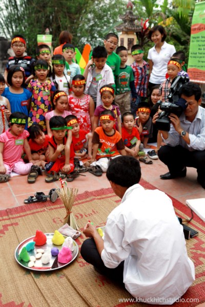 Theo chân bác Vũ Văn Hiền - con trai Nghệ nhân Vũ Văn Diền, chúng mình ra sân Chùa để làm Tò He. Không gian nơi đây thật cổ kính và yên tĩnh. Từ đôi bàn tay khéo léo của bác Hiền, những viên bột màu hoá thành những chú gà trống dũng mãnh, cô lợn hồng đáng yêu, Tôn Ngộ Không tài phép… “Làm Tò He đòi hỏi phải kiên trì, khéo léo, tỉ mỉ đến từng chi tiết. Phải biết quan sát, tưởng tượng và sáng tạo để chọn màu sắc kết hợp hài hòa...” – Bác Hiền chia sẻ. “Các khán giả nhí” cứ tròn xoe mắt ngắm nhìn và trầm trồ, thán phục. Ai cũng háo hức mong được thử tài. Và giây phút ấy đã đến !
